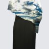 Length: 37.5″, Black stretch knit dress underlayer, Premium ITY Knit (95% Polyester, 5% Spandex), Asymmetrical seethrough chiffon cape (100% Polyester), Covers shoulders and upper arms, Shape-flattering, Machine Washable, Sizes XS to XL.