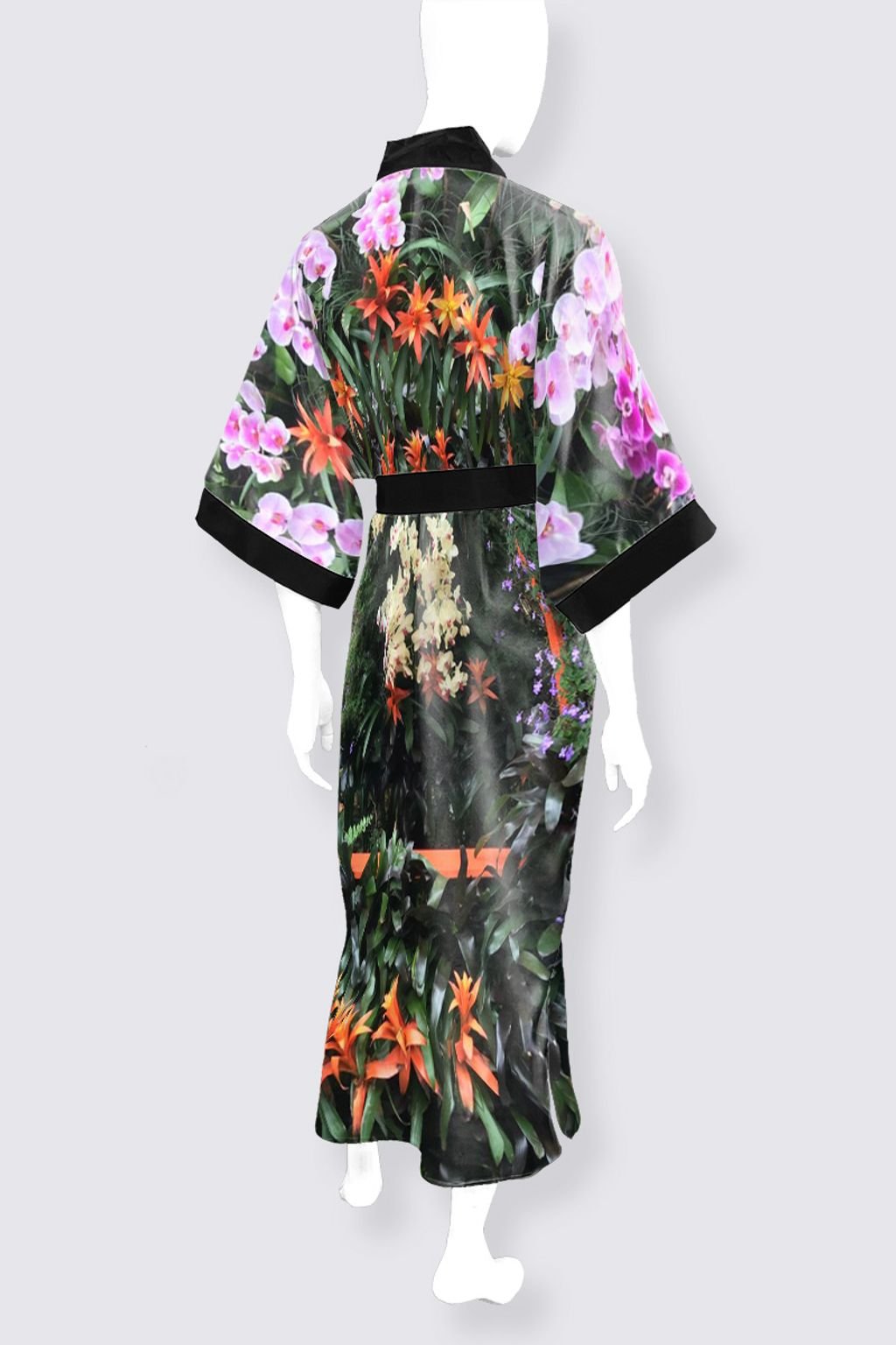 Elegantly lined in black satin, this exquisite piece exudes sophistication with every wear. Complete with a matching black satin belt, it offers a customizable fit to accentuate your silhouette. Featuring slits on both sides for ease of movement, this kimono boasts a length of 52 inches, providing graceful coverage.